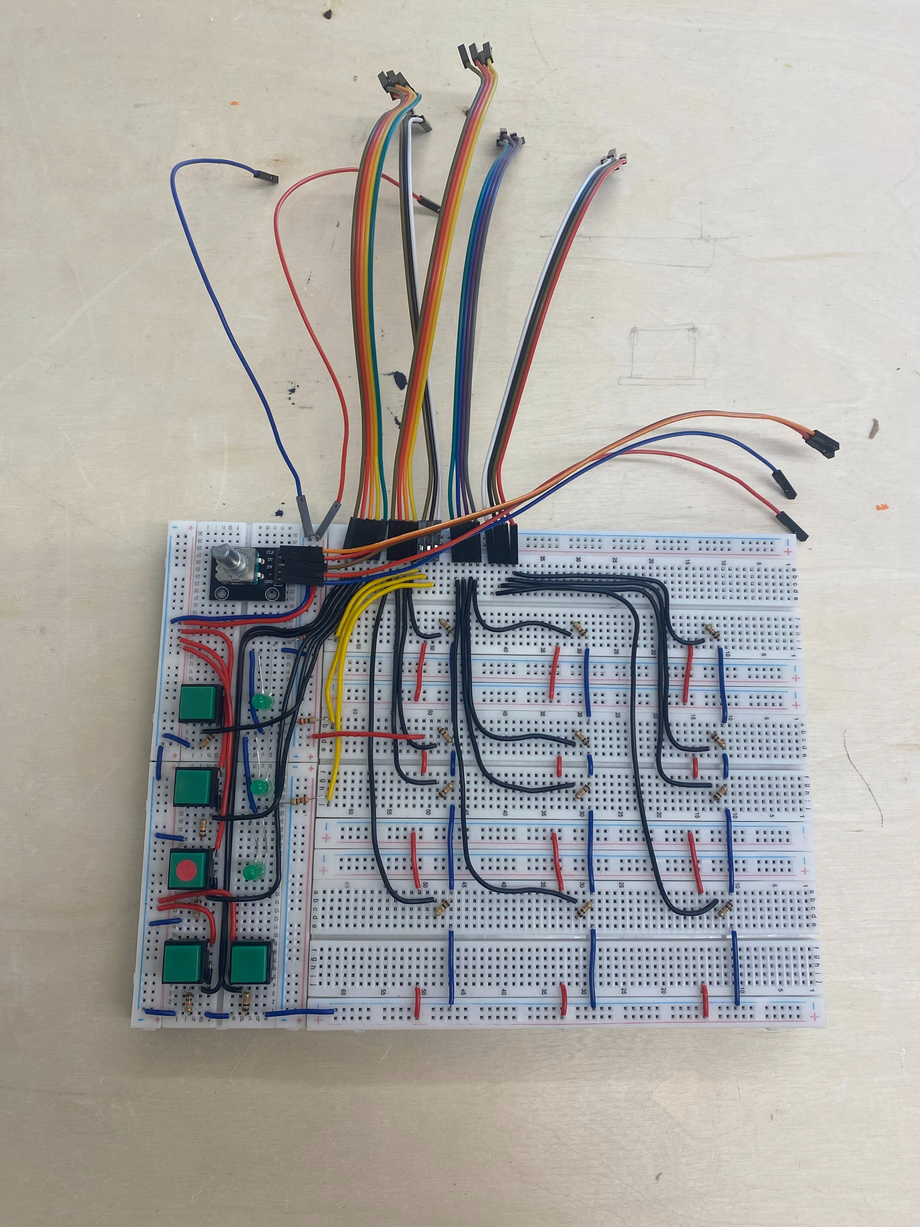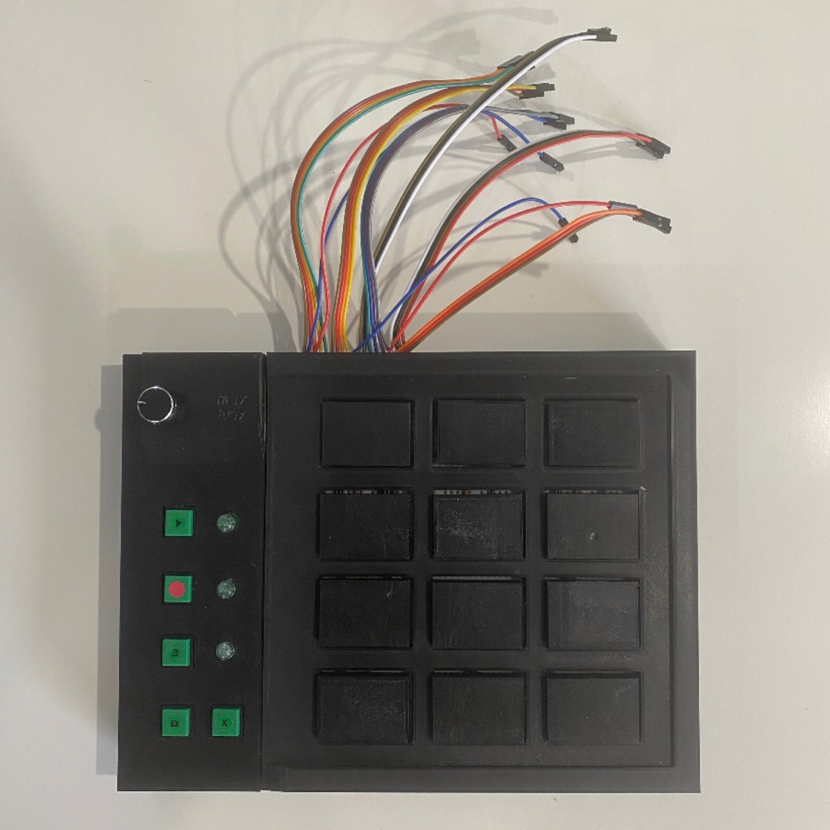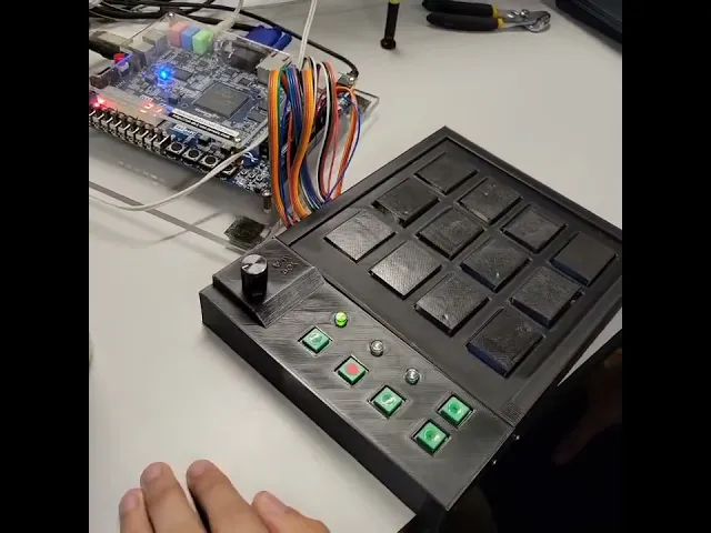 We designed and built the entire physical system ourselves. I modeled the enclosure and the twelve soft pads in Fusion 360, 3D-printed the shell in PLA and the button caps in TPU, and hand-wired the sound pads and control buttons to the DE1-SoC via the GPIO header. The breadboard section routes pad/button signals, and the FPGA handles debouncing/edge-detection and audio generation/mixing before driving speakers through the board’s Audio CODEC.