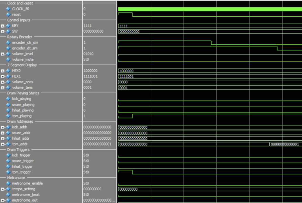 My Verilog focused on the audio recording and playback engine. The logic for this section of the project is based around a finite-state machine. In the recording state, each pad press is logged as a timestamped event: a 30-bit clock cycle counter captures when the hit occurs, and a 12-bit button mask captures which of the 12 pads were hit. After 16 seconds, we enter a waiting state to let the user keep or discard the recording. When the user presses the play button, we enter the play state and a counter replays the sequence by matching the running time against the saved timestamps and re-triggering the same pad sounds, producing a loop of the recorded beat. We synthesized the design with Intel Quartus Prime and verified module behavior with ModelSim testbenches.